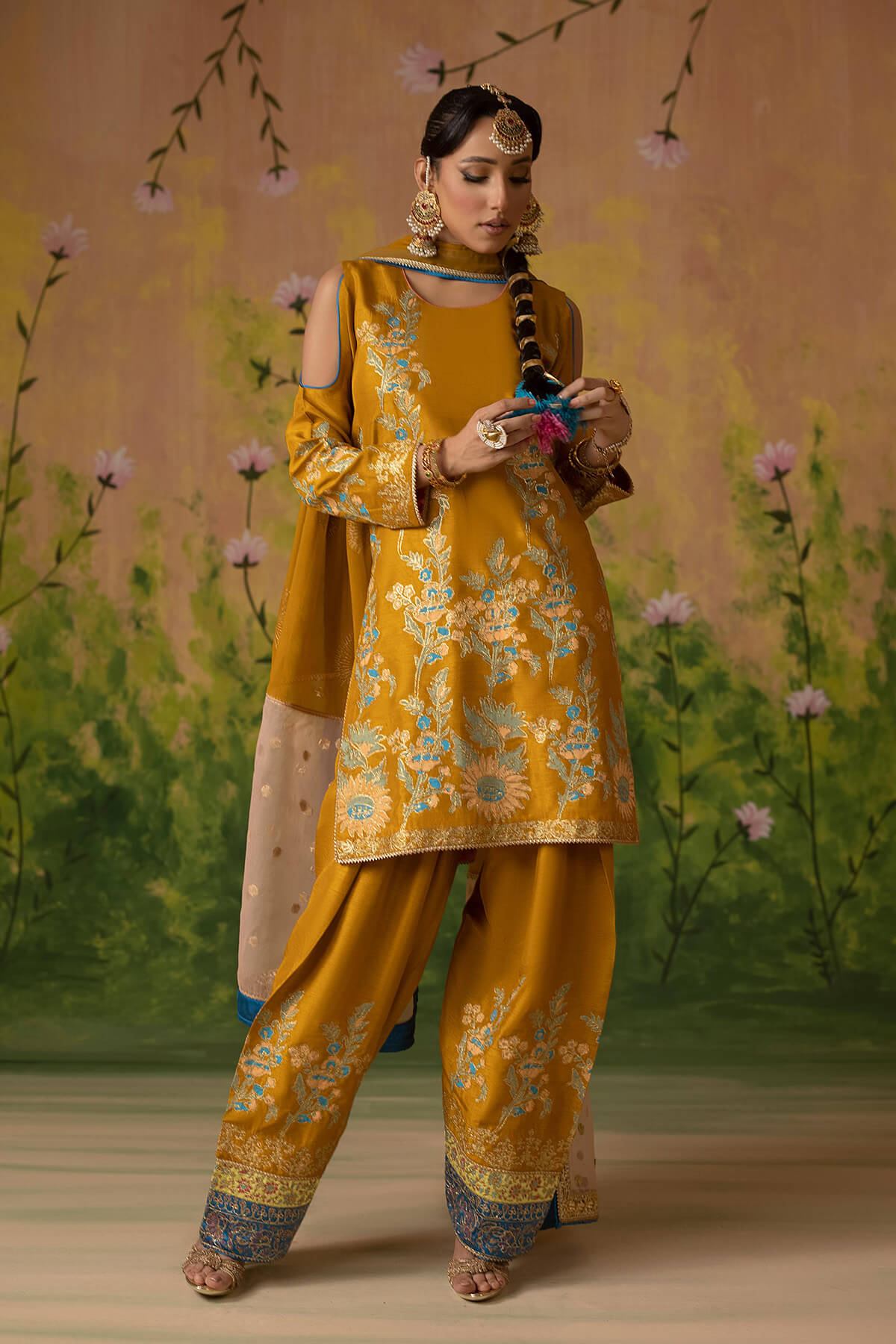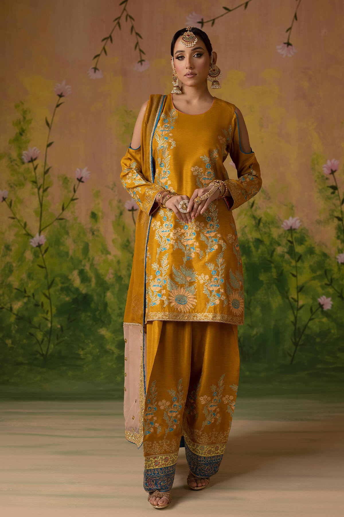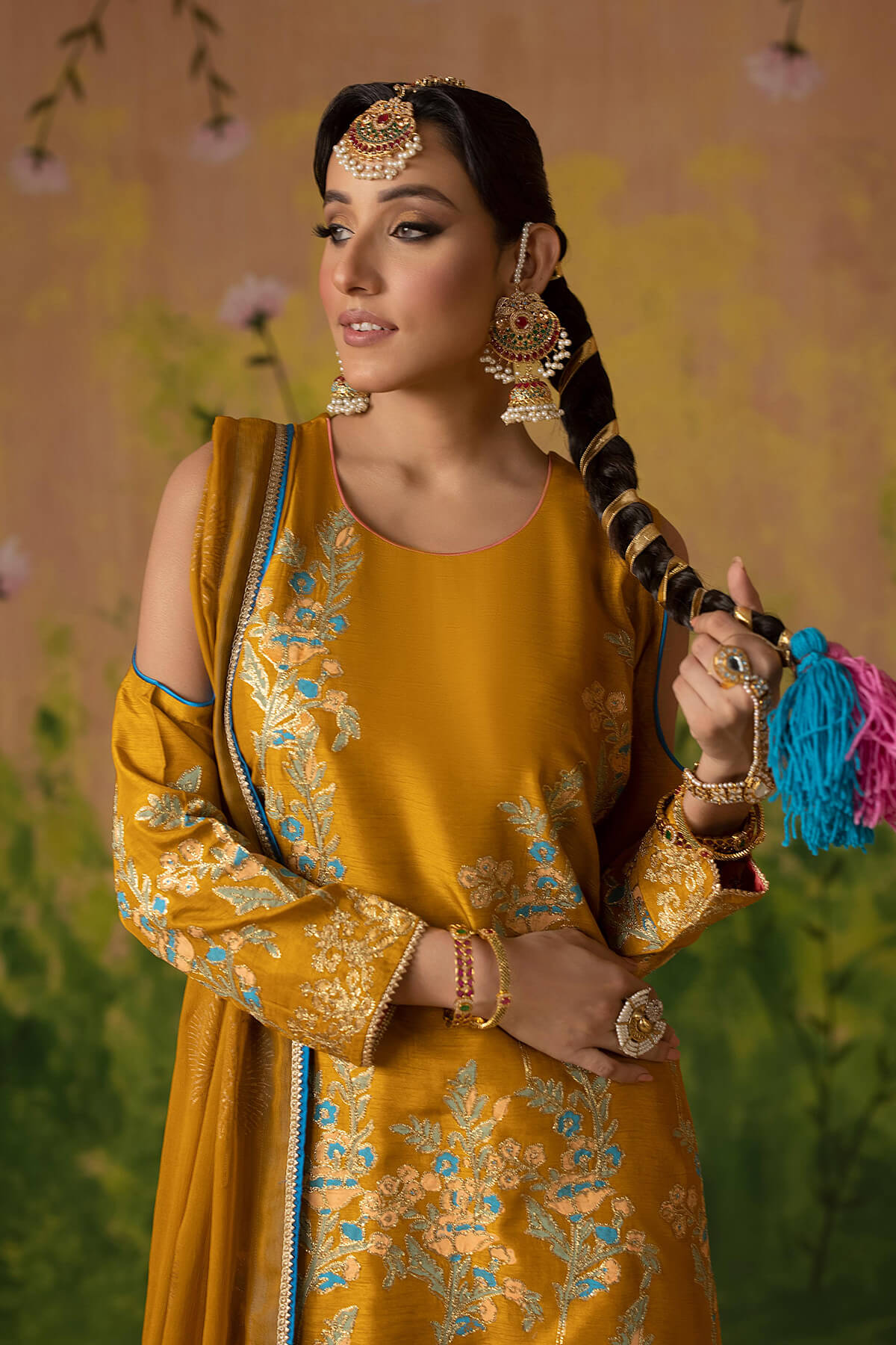 Introducing the raw silk embroidered shirt with embroidered trousers, comes with chiffon dupatta and embroidered organza border.