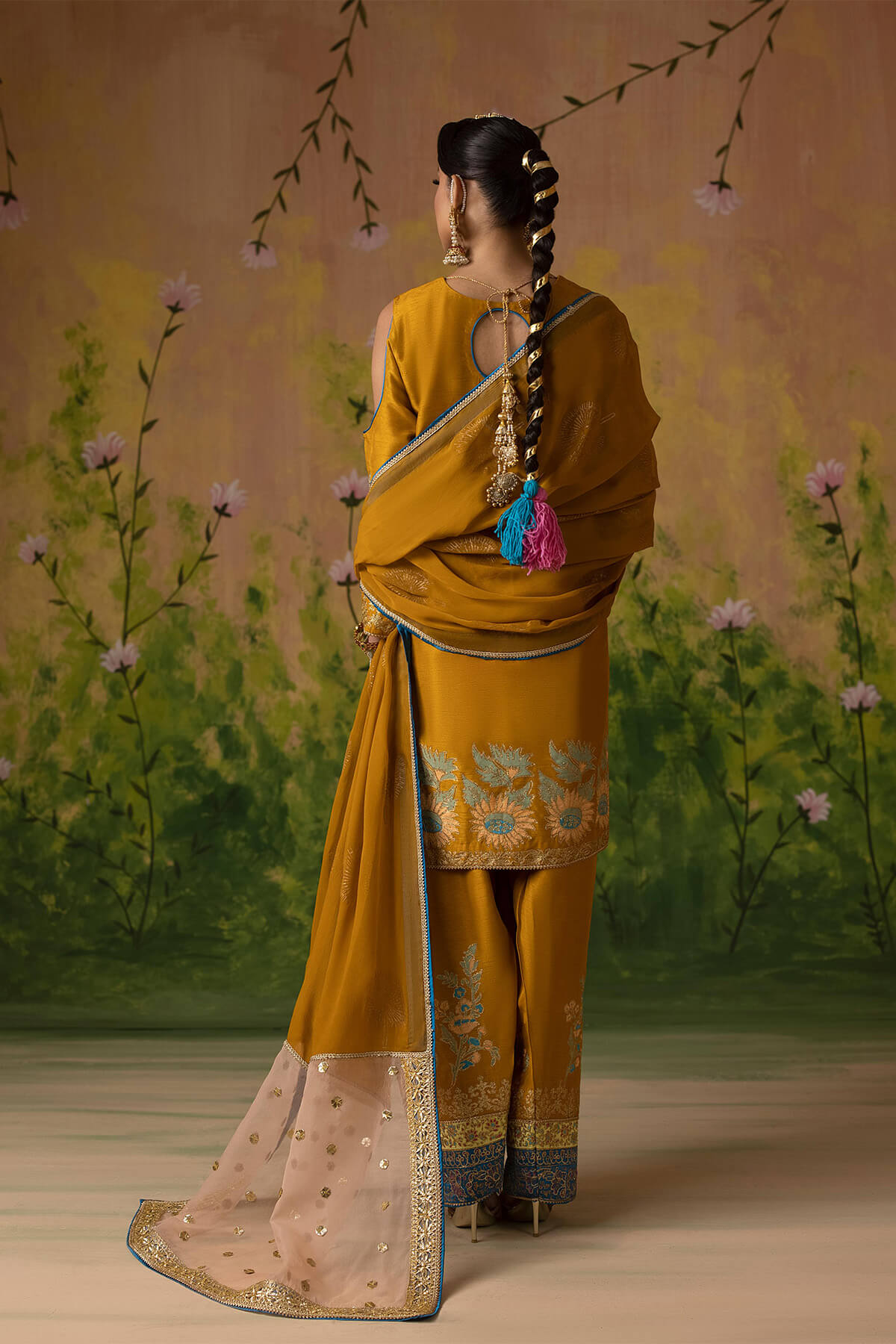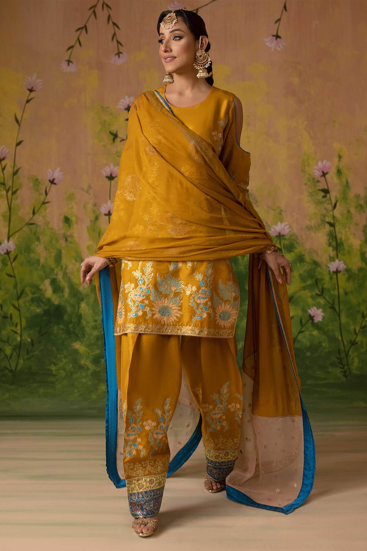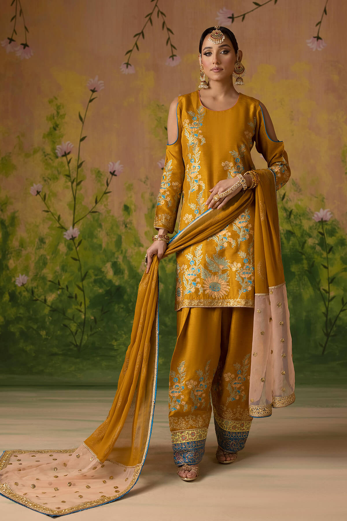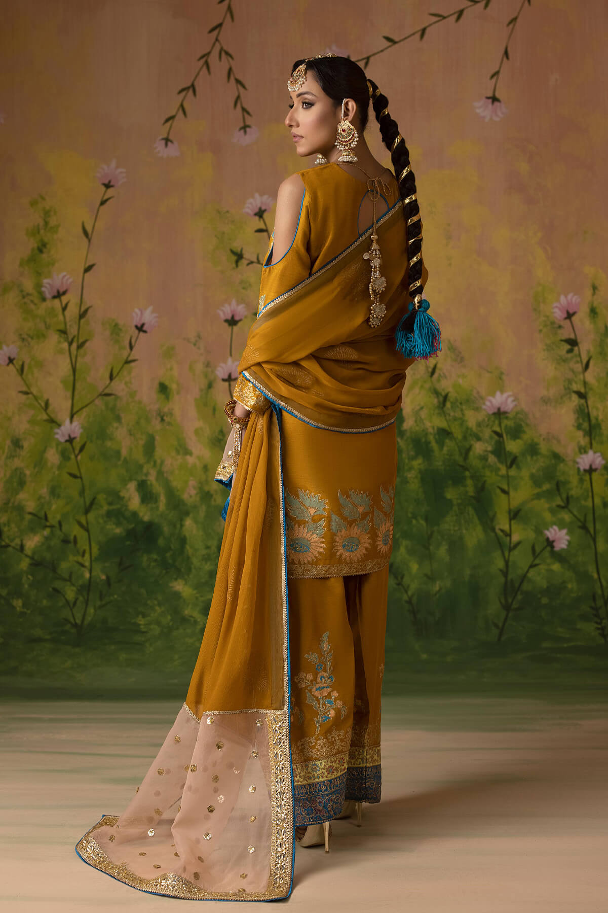 Introducing the raw silk embroidered shirt with embroidered trousers, comes with chiffon dupatta and embroidered organza border.